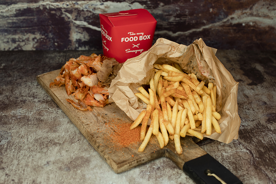 mięso do wyboru (wołowe, kurczak, mix), frytki, sos do wyboru (łagodny, średni, ostry, czosnkowy)