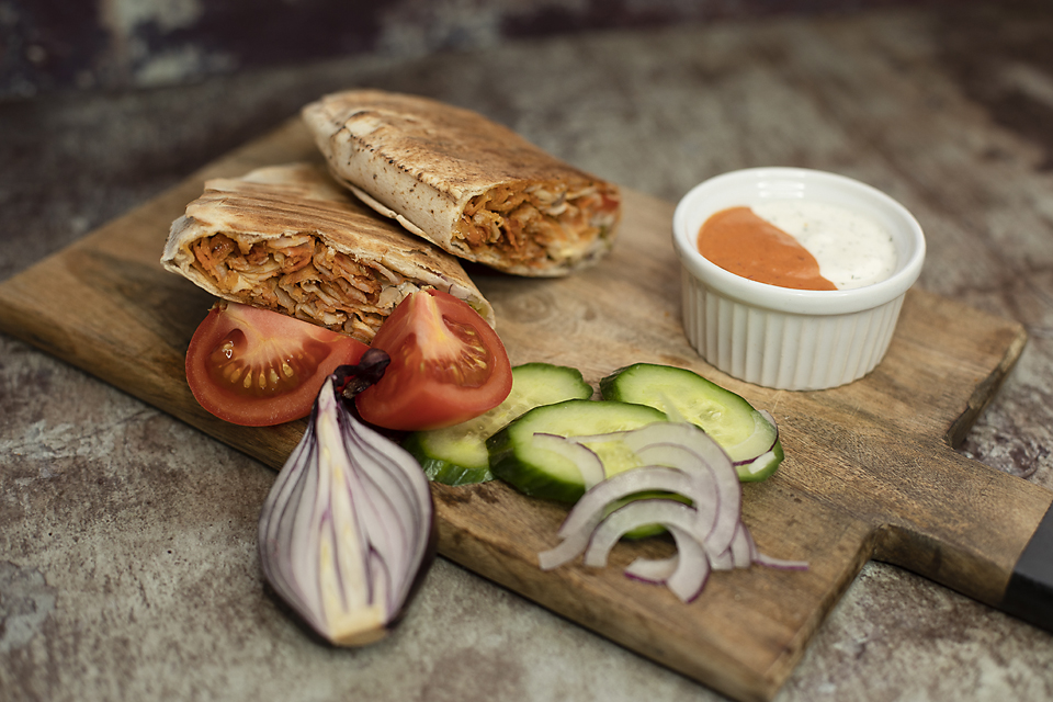 mięso do wyboru (wołowe, kurczak, mix), sezonowa mieszanka sałat i warzyw, sos do wyboru (łagodny, średni, ostry, czosnkowy)