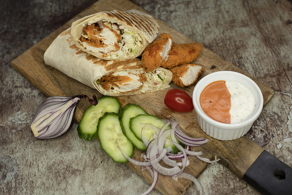 stripsy, sezonowa mieszanka sałat i warzyw, sos do wyboru (łagodny, średni, ostry, czosnkowy)