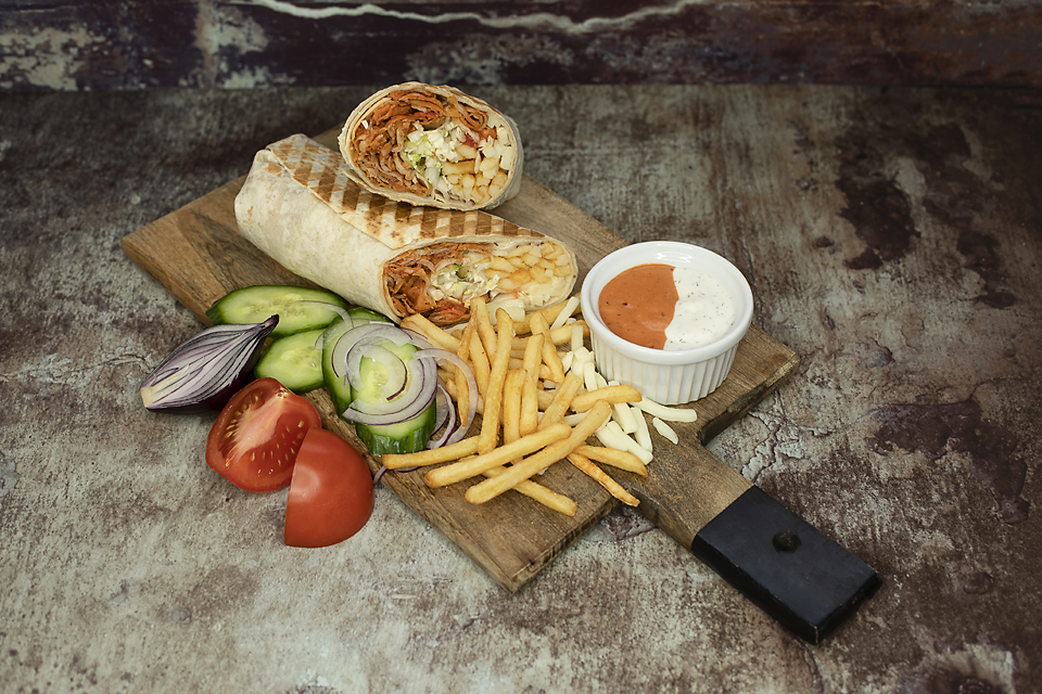 mięso do wyboru (wołowe, kurczak, mix), sezonowa mieszanka sałat i warzyw, frytki, ser, sos do wyboru (łagodny, średni, ostry, czosnkowy)
