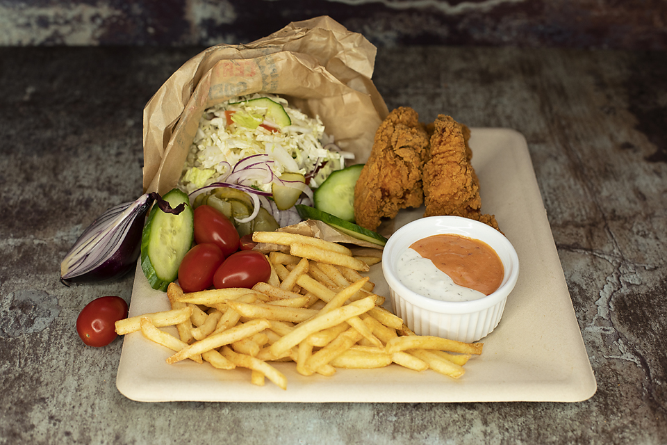 stripsy, sezonowa mieszanka sałat i warzyw, frytki, sos do wyboru (łagodny, średni, ostry, czosnkowy)
