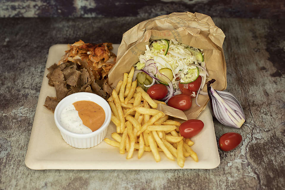 mięso do wyboru (wołowe, kurczak, mix), sezonowa mieszanka sałat i warzyw, frytki, sos do wyboru (łagodny, średni, ostry, czosnkowy)
